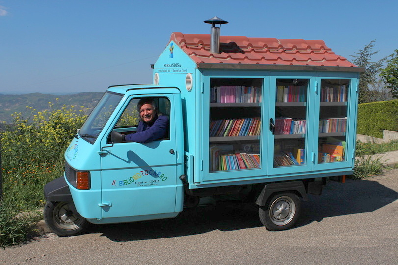 Antonio La Cava es un profesor de escuela jubilado de Ferrandina (Italia) que después de 42 años en la enseñanza decidió que podía hacer aún más para difundir el amor por la lectura a los niños. Para ello, en el año 2003 compró una motocicleta Ape y la modificó para transformarla en una biblioteca sobre ruedas. El ‘bibliomotocarro‘ – nombre con el que la bautizó – es un curiosos vehículo de color azul con estanterías en los lados que contiene cerca de 700 libros y a la que puso incluso un techo de tejas y una chimenea.